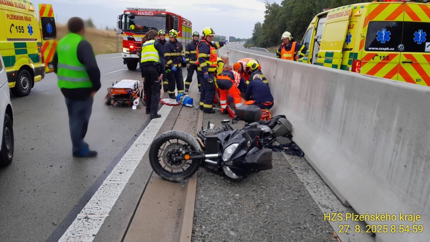 Na 125. kilometru dálnice D5 na Tachovsku ve směru z Plzně na Rozvadov havaroval asi padesátiletý motocyklista. Kvůli přistání záchranářského vrtulníku musela být dálnice v místě nehody uzavřena v obou pruzích.