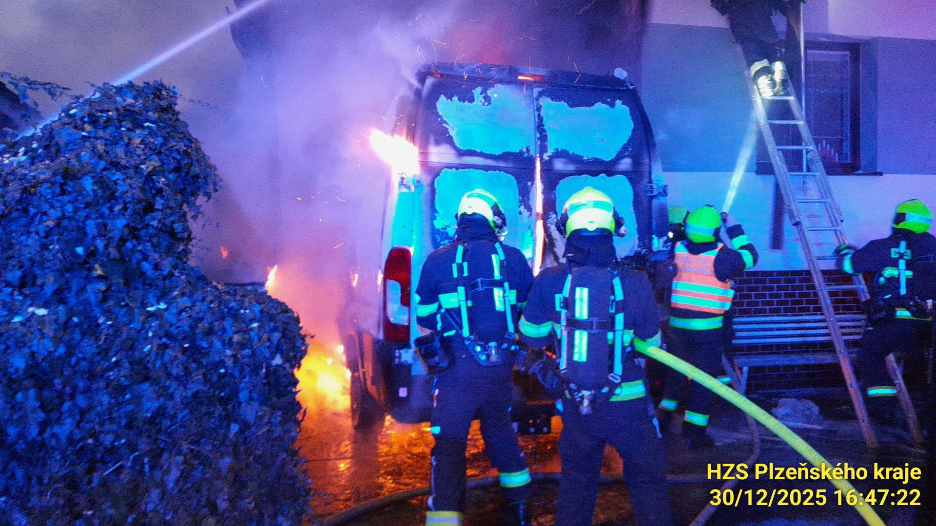 V Tlučné na severním Plzeňsku hořela dnes odpoledne obytná dodávka stojící pod přístřeškem rodinného domu. Oheň se částečně přenesl i na sousední obytný dům. Nikdo nebyl zraněn, škoda bude minimálně milion korun.