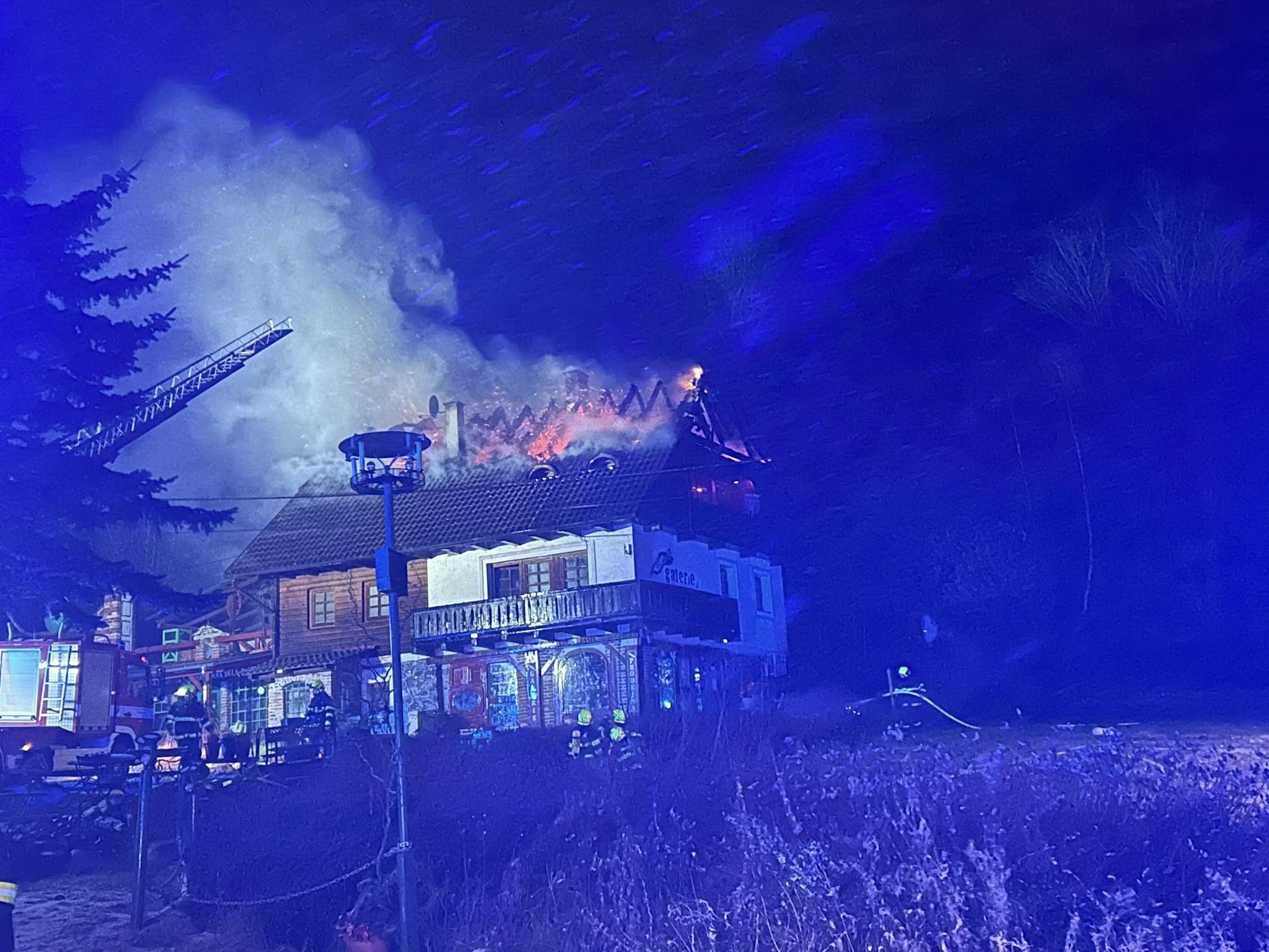"Je to patrový objekt, v době našeho příjezdu byla už střecha celá v plamenech," řekl řídící důstojník krajských hasičů Miroslav Marek. Objekt má zděnou část a dřevěné prvky. Požár vznikl v podkroví. Hasiči museli hořící části rozebírat, hasit a hledat skrytá ohniska. "Konstrukce zůstala, ale dřevěné vnitřky a střecha shořely," dodal Marek. Na místě jsou dnes vyšetřovatelé, kteří zjišťují příčinu požáru.