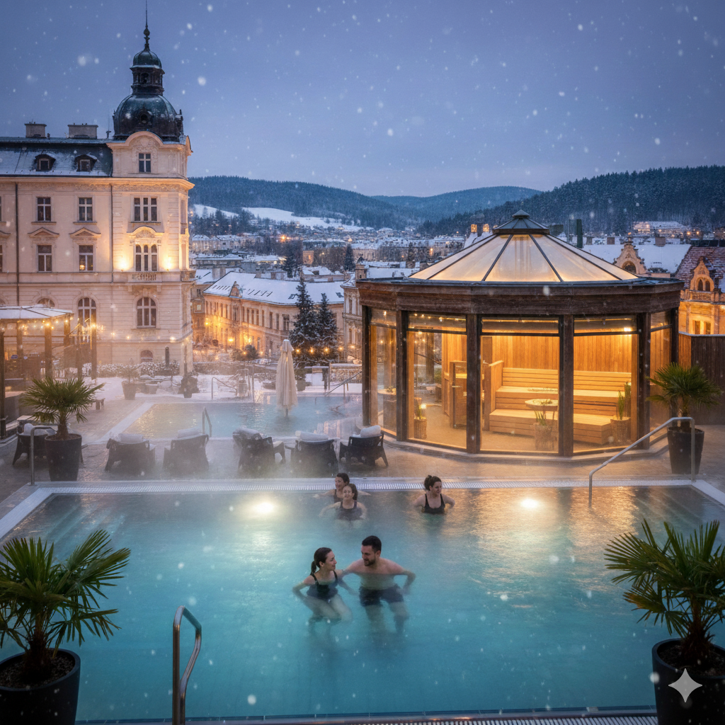 Saunia Thermal Resort (Karlovy Vary): Tohle je naprostý „must-visit“. Venkovní bazén s vřídelní vodou vyhřívaný na příjemnou teplotu i v mrazu nabízí ikonický výhled na město. Saunový svět s několika typy ceremoniálů je pak třešničkou na dortu.