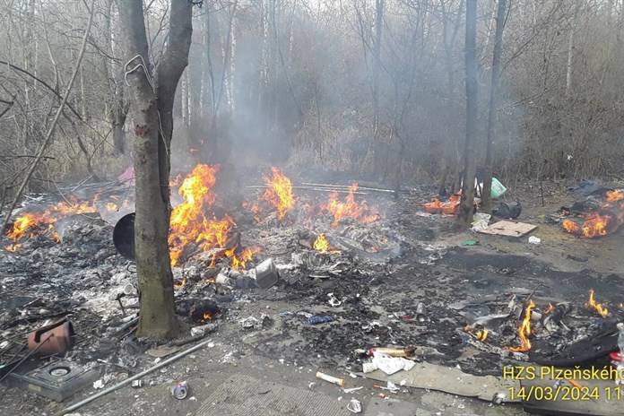 Aktualizováno 12:40 Tzv. kemp bezdomovců nacházející se za nemocnicí Privamed a fotbalovým hřištěm na Vinicích zachvátil dnes dopoledne požár. Vážně popálenou ženu transportuje do nemocnice vrtulník.