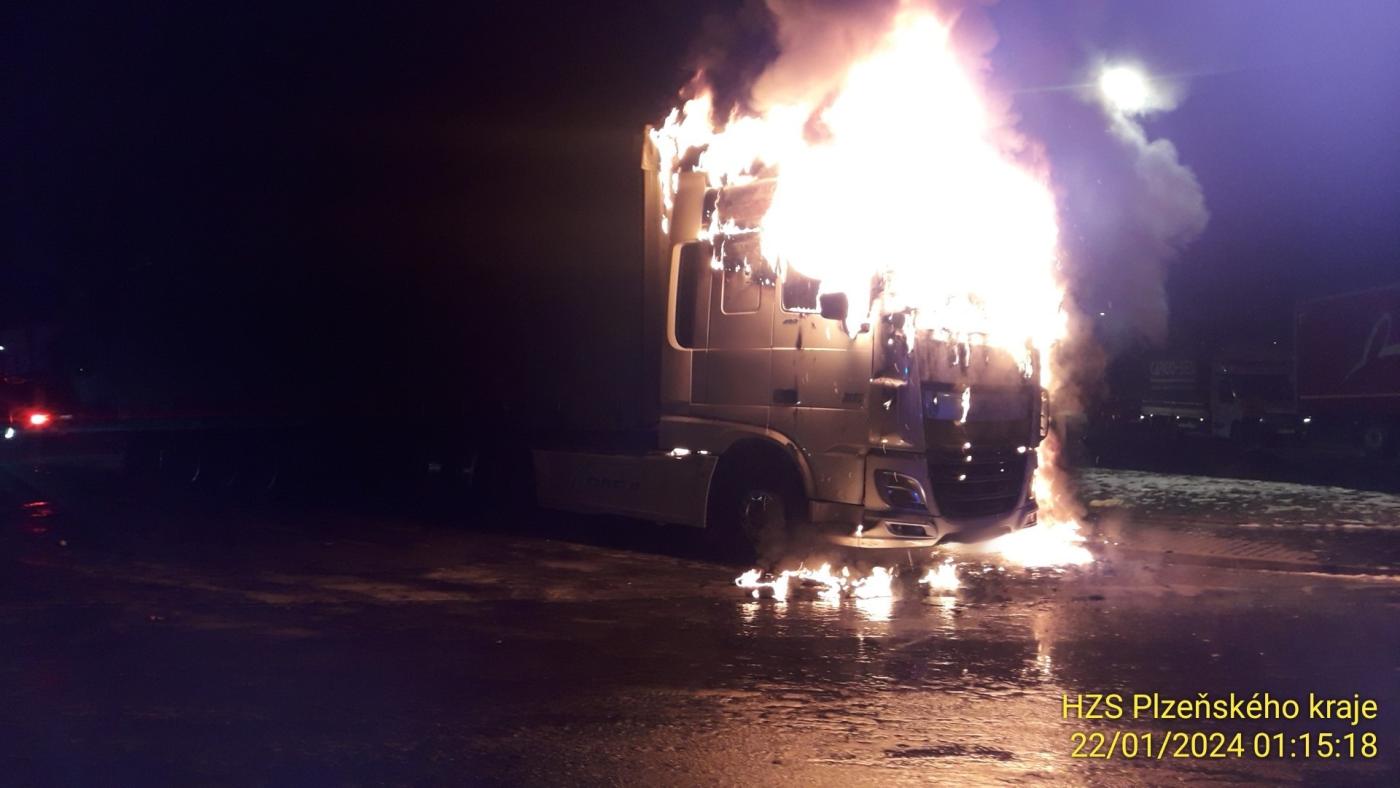 Kamion začal hořet krátce po 1. hodině v noci. "Oheň zasáhl zejména kabinu tahače a sálavé teplo částečně poškodilo i návěs," popsal mluvčí krajských hasičů Petr Poncar.