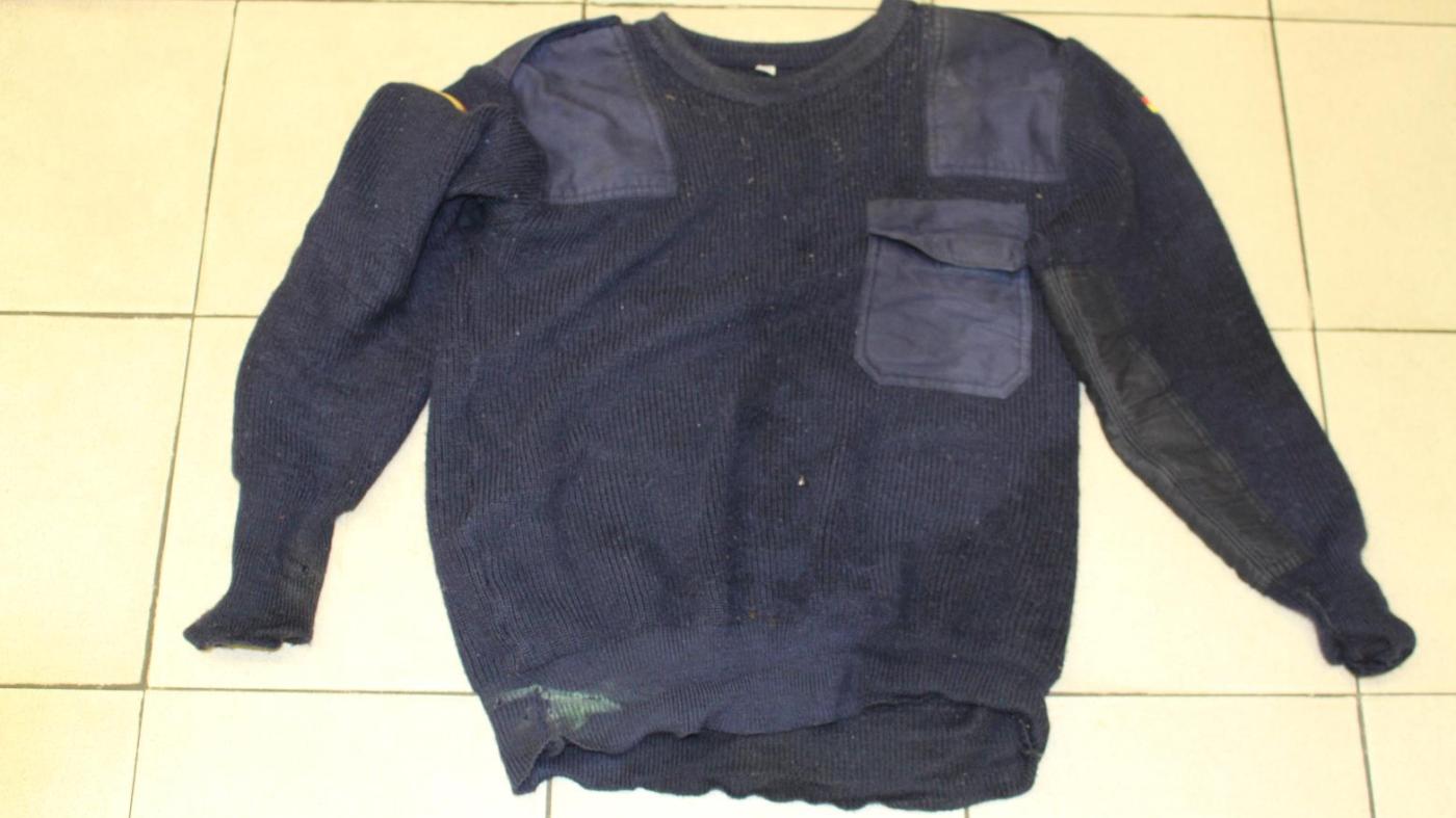 Muž měl na sobě černou zimní bundu s tenkým bílým proužkem a kapucí velikosti M, tmavě modrý svetr s německými vlajkami na ramenou, modré triko s dlouhým rukávem, modré džíny a kotníkové boty značky Kilimanjaro velikosti 42.