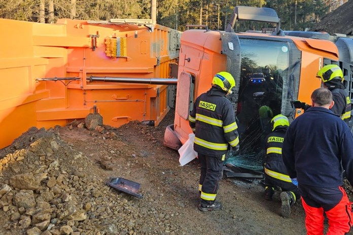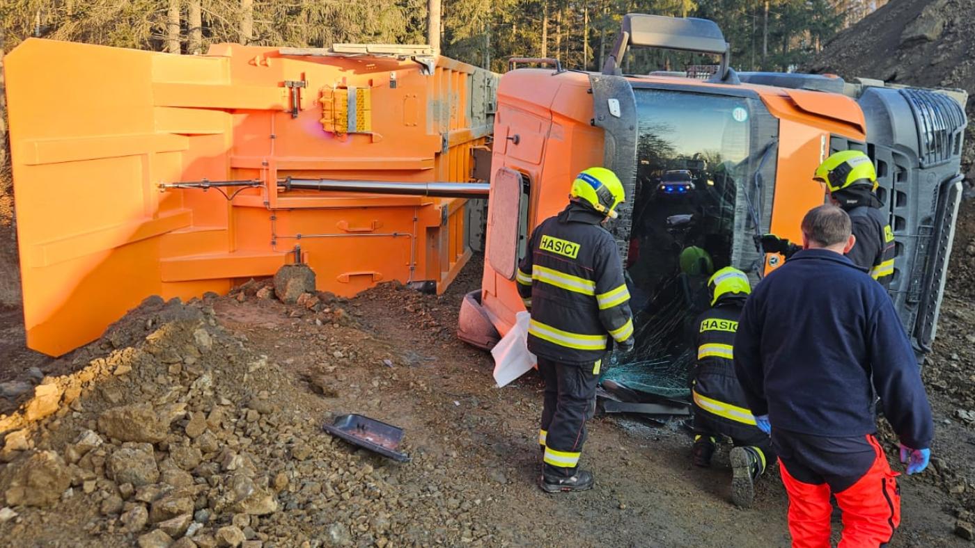 Všechny záchranné složky vyjížděly k události krátce po 16. hodině. "Řidič ročník 1973 pracovního stroje tovární značky Mercedes vyklápěl náklad, při sklopení sklápěčky se přesunul naložený materiál na stranu a svoji vahou převážil stroj, který se převrátil," uvedla policejní mluvčí Eva Červenková.