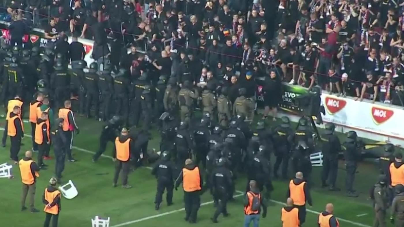 "S ohledem na skutečnost, že se pořadatelské službě nepodařilo zabránit vstupu fanoušků obou týmu na hrací plochu, museli jsme s ohledem na obnovení veřejného pořádku, zmírnění eskalace a zabránění vzájemného napadání fanoušků obou týmu vstoupit na hrací plochu. Několik osob, které na policisty útočily, jsme přímo na hrací ploše omezili na osobní svobodě," uvedla policejní mluvčí Pavla Burešová.