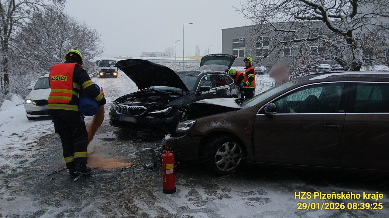 V Plzni v ulici Na Roudné ráno na zledovatělé silnici havaroval autobus MHD. Narazil do stromu, informoval mluvčí hasičů Petr Poncar. "Na místě dopravní nehody jsme do péče převzali ženu, ročník 1957, která byla transportována do zdravotnického zařízení s lehkým poraněním v oblasti hlavy," uvedl mluvčí záchranné služby Martin Štěpán. Další nehoda se podle Poncara stala například na kraji Vejprnic, kde se střetla dvě osobní auta, komunikace byla neprůjezdná. U obce Třebnice na Domažlicku havarovala čtyři osobní auta, jedno z nich je částečně na boku. Dvě osobní auta havarovala v Plzni-Božkově.