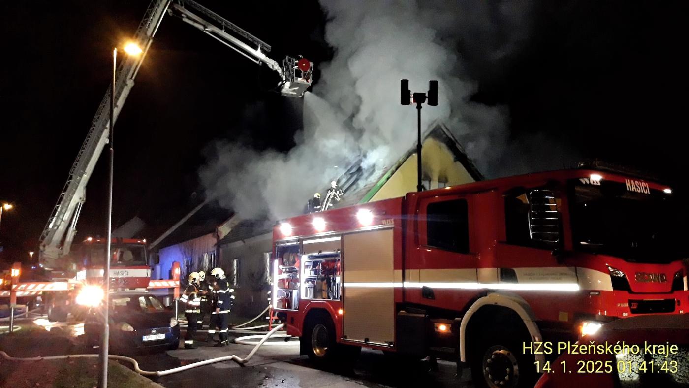 Pět hasičských jednotek vyjíždělo k požáru rodinného domu po 1. hodině. "Oheň zasáhl střechu a půdní prostor. Na hašení jsme nasadili tři útočné proudy. Využili jsme i výškovou techniku," uvedl mluvčí krajských hasičů Petr Poncar.